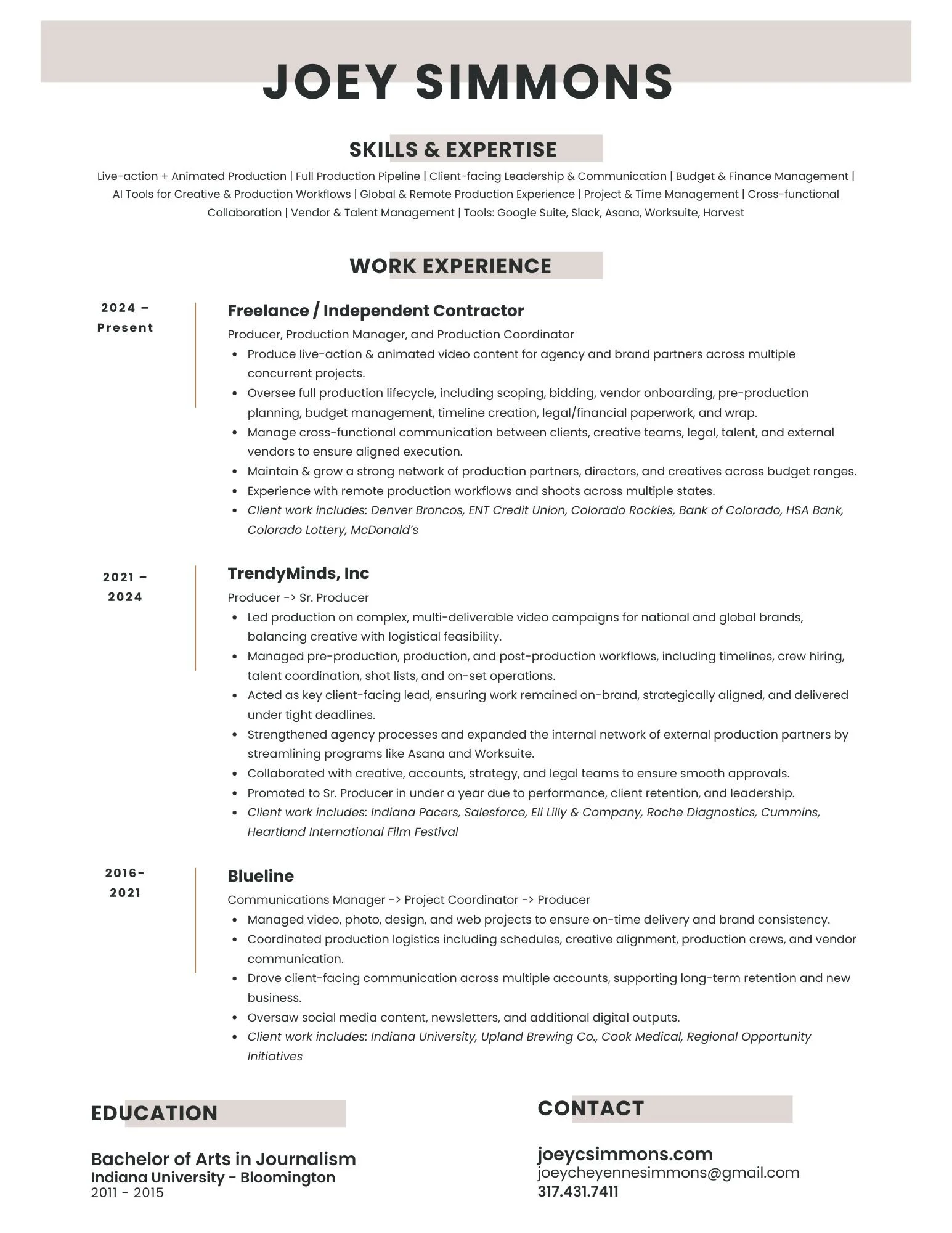 This page has my full professional resume, outlining my experience producing content across social, branded, broadcast, and corporate projects. If you’re looking for a producer who’s calm under pressure, collaborative, and deeply invested in bringing ideas to life, this is the place to get a closer look.